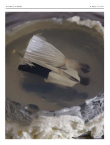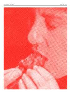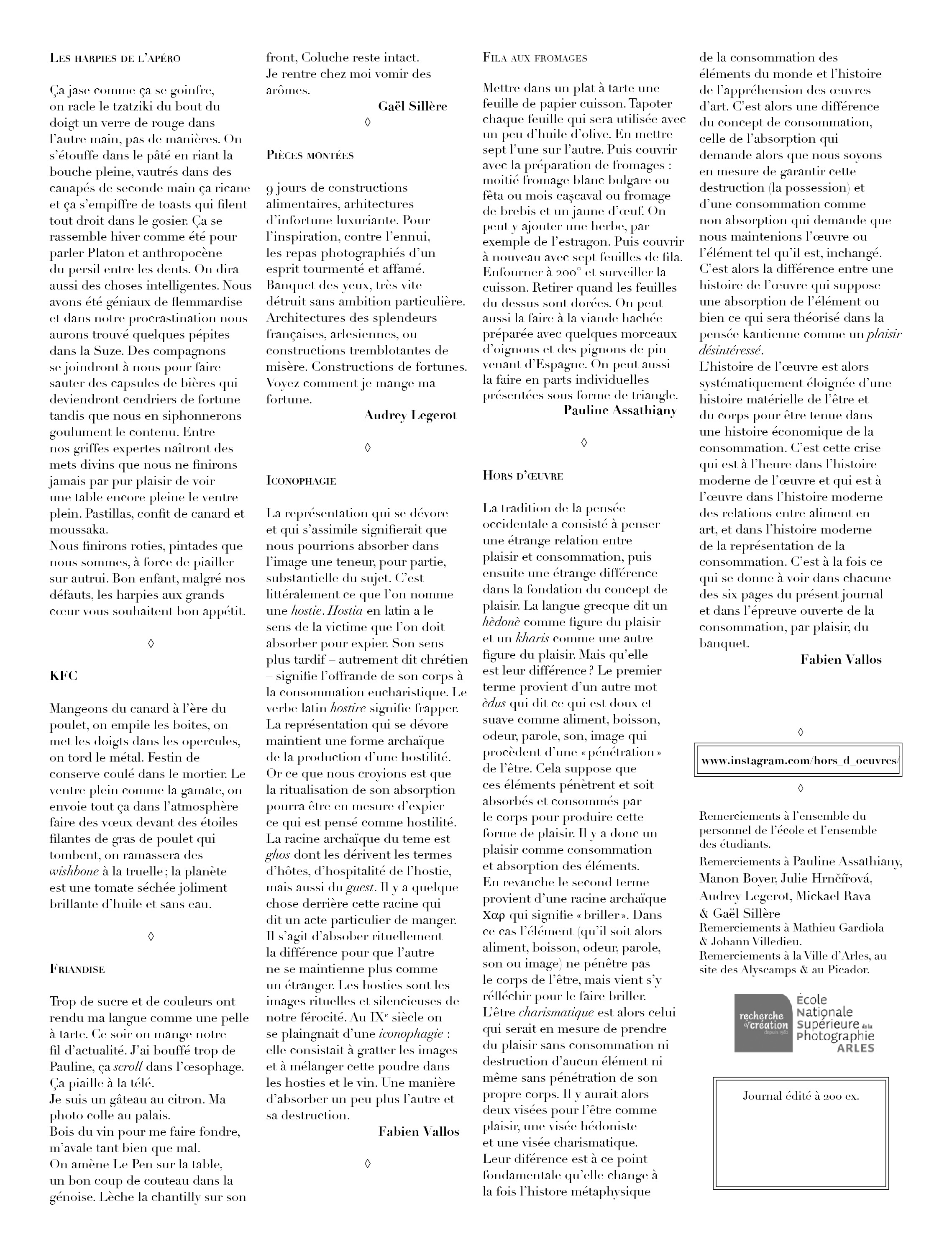 L’histoire de l’œuvre est alors systématiquement éloignée d’une histoire matérielle de l’être et du corps pour être tenue dans une histoire économique de la consommation. C’est cette crise qui est à l’heure dans l’histoire moderne de l’œuvre et qui est à l’œuvre dans l’histoire moderne des relations entre aliment en art, et dans l’histoire moderne de la représentation de la consommation. C’est à la fois ce qui se donne à voir dans chacune des six pages du présent journal et dans l’épreuve ouverte de la consommation, par plaisir, du banquet.