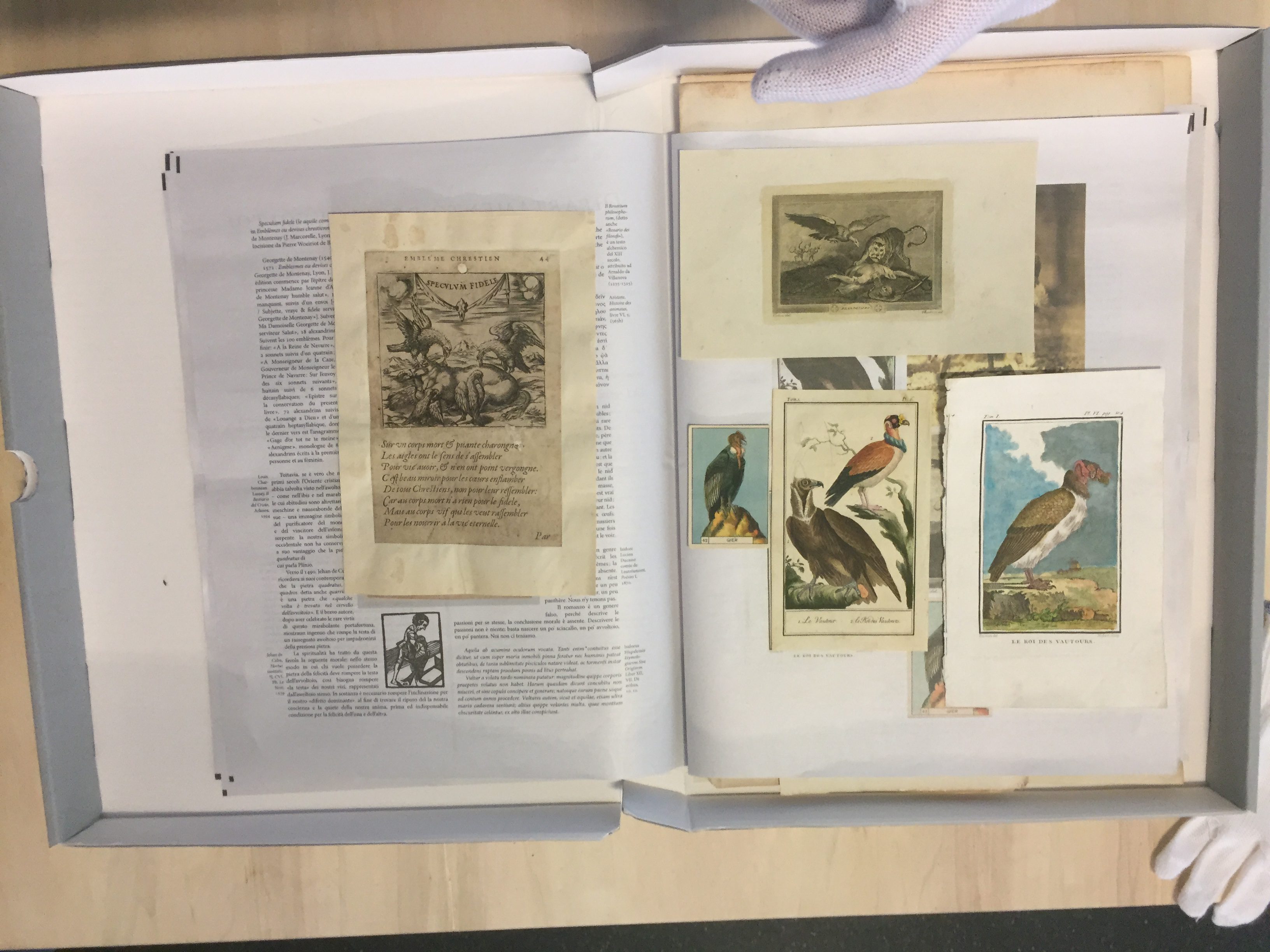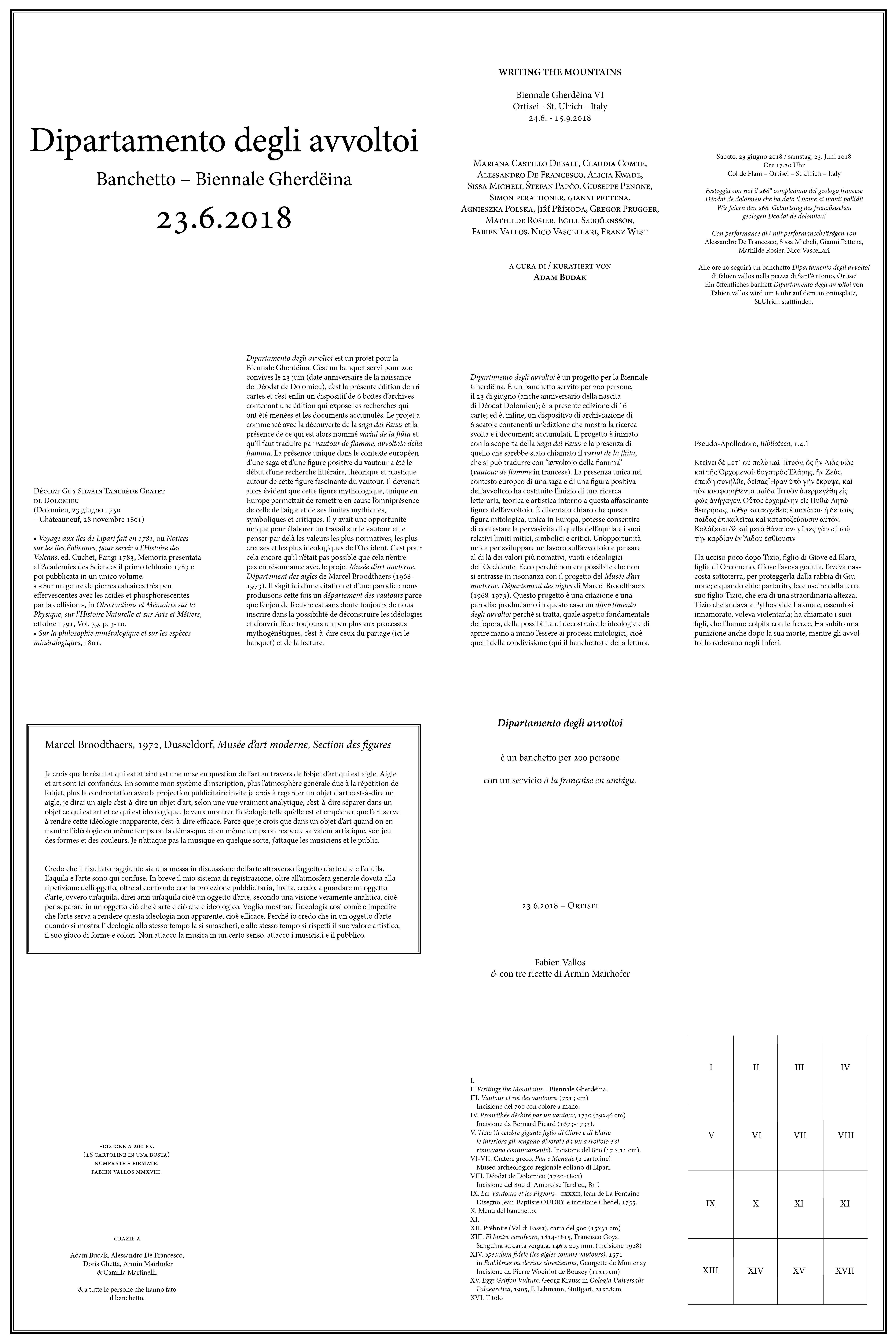 Dipartimento degli avvoltoi est un projet pour la Biennale Gherdëina. C’est un banquet servi pour 200 convives le 23 juin (date anniversaire de la naissance de Déodat de Dolomieu), c’est la présente édition de 16 cartes et c’est enfin un dispositif avec une boite d’archives contenant une édition qui expose les recherches qui ont été menées et les documents accumulés. Le projet a commencé avec la découverte de la saga dei Fanes et la présence de ce qui est alors nommé variul de la flüta et qu’il faut traduire par vautour de flamme, avvoltoio della fiamma. La présence unique dans le contexte européen d’une saga et d’une figure positive du vautour a été le début d’une recherche littéraire, théorique et plastique autour de cette figure fascinante du vautour. Il devenait alors évident que cette figure mythologique, unique en Europe permettait de remettre en cause l’omniprésence de celle de l’aigle et de ses limites mythiques, symboliques et critiques. Il y avait une opportunité unique pour élaborer un travail sur le vautour et le penser par delà les valeurs les plus normatives, les plus creuses et les plus idéologiques de l’Occident. C’est pour cela encore qu’il n’était pas possible que cela n’entre pas en résonnance avec le projet Musée d’art moderne. Département des aigles de Marcel Broodthaers (1968-1973). Il s’agit ici d’une citation et d’une parodie : nous produisons cette fois un département des vautours parce que l’enjeu de l’œuvre est sans doute toujours de nous inscrire dans la possibilité de déconstruire les idéologies et d’ouvrir l’être toujours un peu plus aux processus mythogénétiques, c’est-à-dire ceux du partage (ici le banquet) et de la lecture.