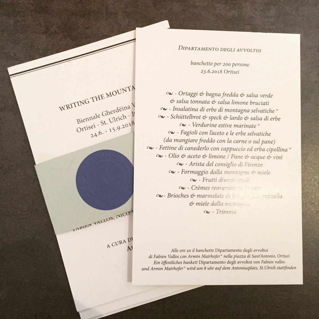 Dipartimento degli avvoltoi è un progetto per la Biennale Gherdëina. È un banchetto servito per 200 persone, il 23 di giugno (anche anniversario della nascita di Déodat Dolomieu); è la presente edizione di 16 carte; ed è, infine, un dispositivo di archiviazione di una scatola contenenti un’edizione che mostra la ricerca svolta e i documenti accumulati. Il progetto è iniziato con la scoperta della Saga dei Fanes e la presenza di quello che sarebbe stato chiamato il variul de la flüta, che si può tradurre con “avvoltoio della fiamma” (vautour de flamme in francese). La presenza unica nel contesto europeo di una saga e di una figura positiva dell’avvoltoio ha costituito l’inizio di una ricerca letteraria, teorica e artistica intorno a questa affascinante figura dell’avvoltoio. È diventato chiaro che questa figura mitologica, unica in Europa, potesse consentire di contestare la pervasività di quella dell’aquila e i suoi relativi limiti mitici, simbolici e critici. Un’opportunità unica per sviluppare un lavoro sull’avvoltoio e pensare al di là dei valori più nomativi, vuoti e ideologici dell’Occidente. Ecco perché non era possibile che non si entrasse in risonanza con il progetto del Musée d’art moderne. Département des aigles di Marcel Broodthaers (1968-1973). Questo progetto è una citazione e una parodia: produciamo in questo caso un dipartimento degli avvoltoi perché si tratta, quale aspetto fondamentale dell’opera, della possibilità di decostruire le ideologie e di aprire mano a mano l’essere ai processi mitologici, cioè quelli della condivisione (qui il banchetto) e della lettura.