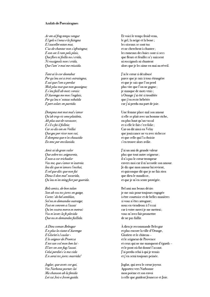 Le deuxième prétexte fut la proximité de la vicomtesse de Narbonne (1134-1193) qui fut un personnage central du XIIe siècle occitan et une protectrice des troubadours. L’art poétique des troubadours tient à une absorption de grands thèmes (comme l’amour, l’autorité, la sincérité, la politique, etc.) dans une disposition poétique nommé « trobar clus », que l’on pourrait littéralement traduire par « jeu fermé ». Le trobar clus est un dispositif conceptuel qui permet de complexes combinatoires de langues pour faire apparaître des sens cachées et des images inattendues. Nous proposons en guise d’exergue à ce banquet la traduction d’une « canso » de la trobairitz Azalaïs de Porcairagues (seul poème qui nous soit parvenu) qui fut adressée dans son envoi à Ermengarde désignée comme « lei cui Jois e Joven guida ».