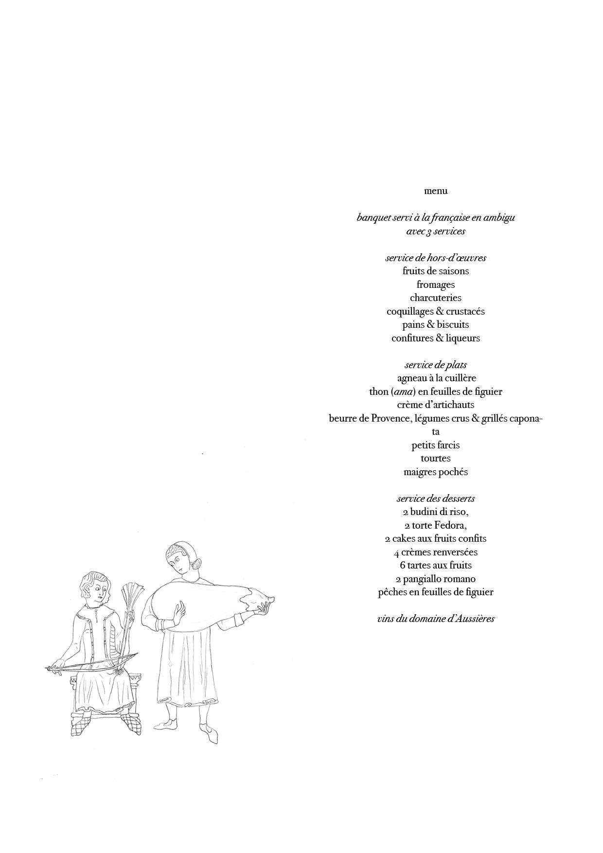Vous avez pris place au banquet XLIX, intitulé Ursariæ qui est le nom attesté d’Aussières juqu’au VIIIe siècle. En langue classique latine, nous pourrions le traduire par « gardienne des ours ». Il est donné le 28 juin 2023 par Fabien Vallos avec Rodrigue de Ferluc. Il est servi à la française en ambigu.