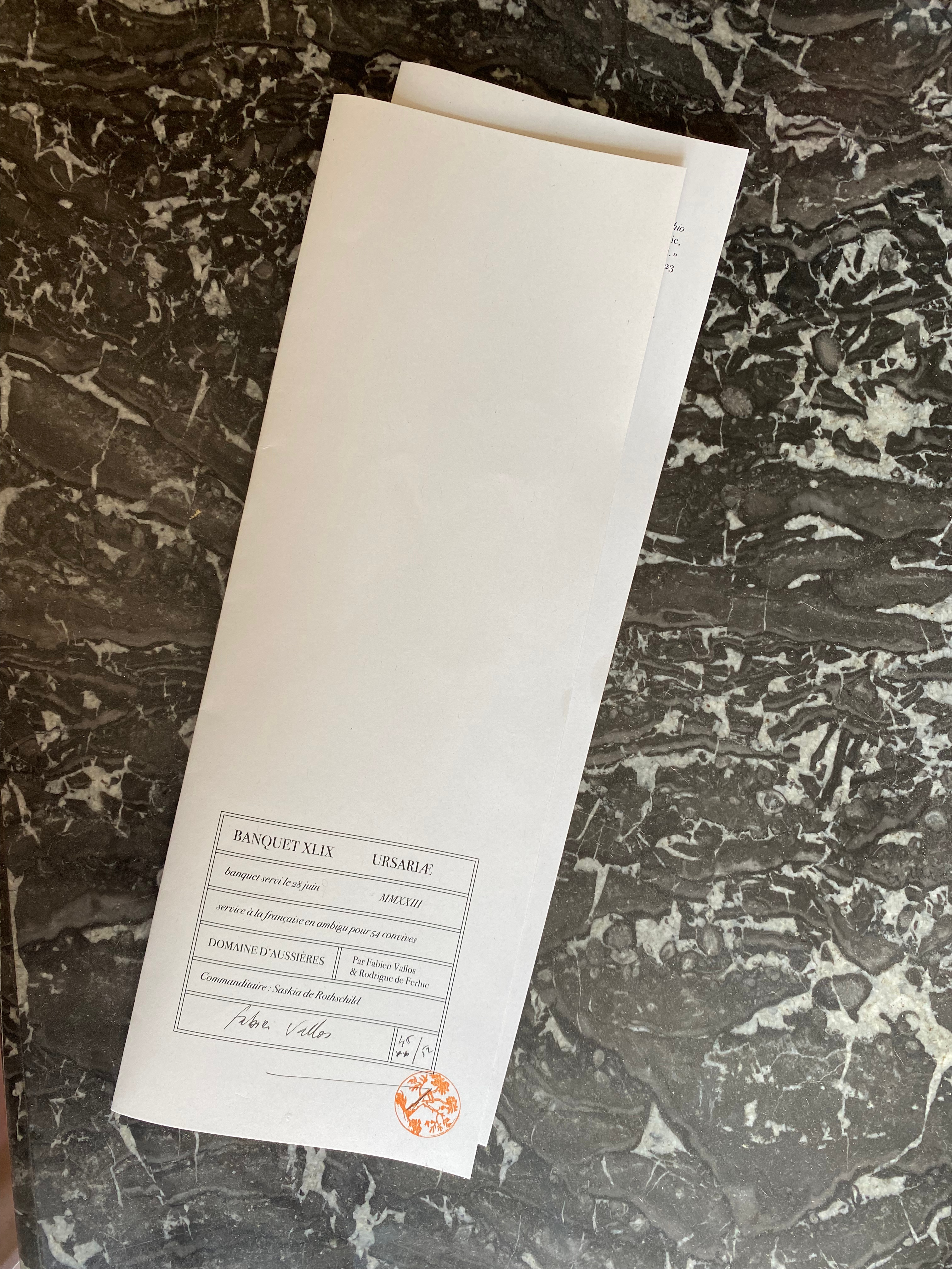 Banquet XLIX, Ursariæ, servi le 28 juin 2023 à la française en ambigu pour 54 convives au domaine d’Aussières.