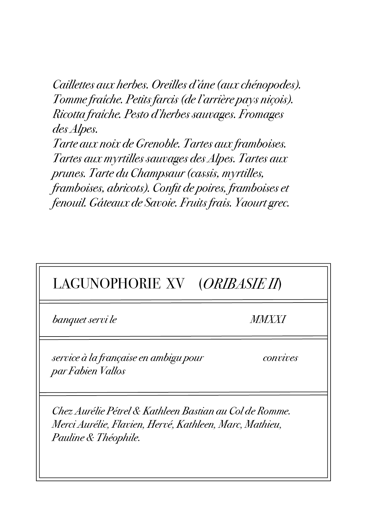 Banquet XXXIV, Oribasie II, servi à la française en ambigu pour 65 personnes au col de Romme