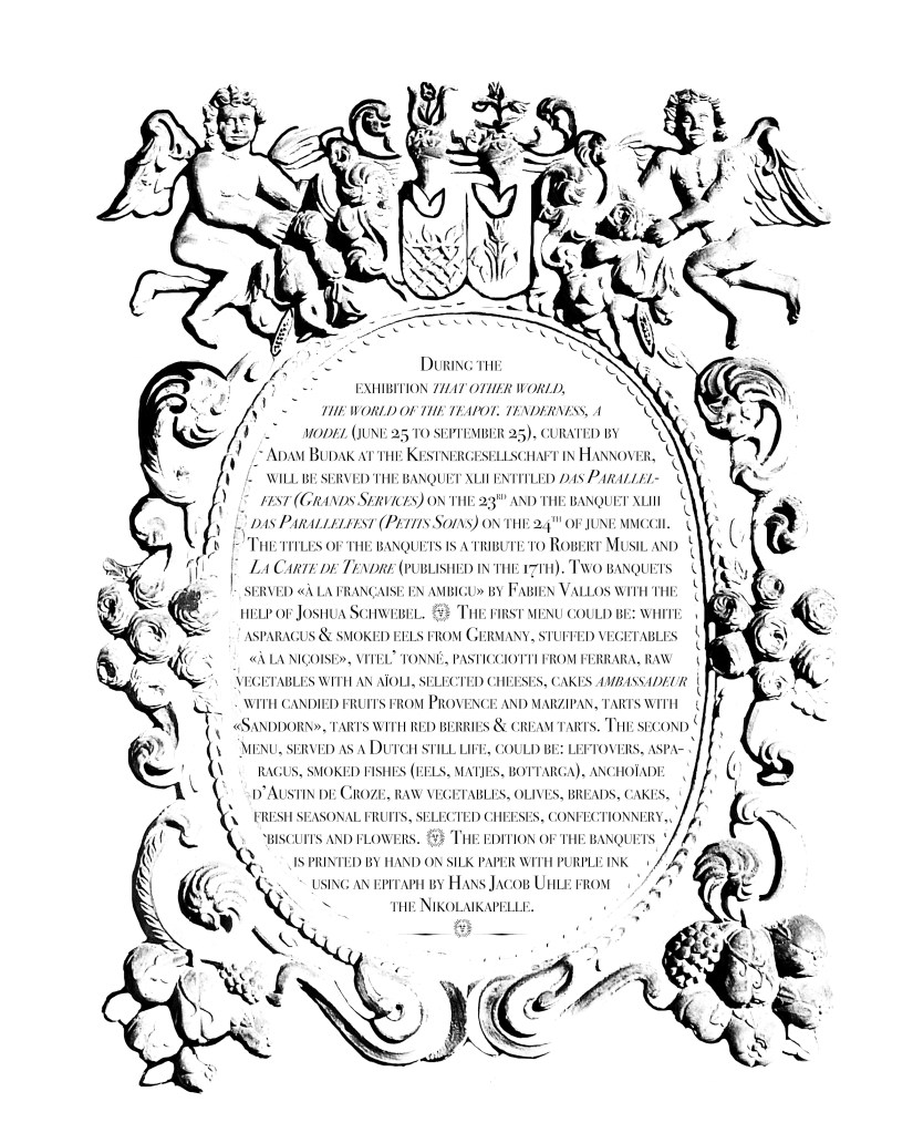 The Banquet XLII entitled Das Parallelfest (Grands Services) is served during the preview of the exhibition that other world, the world of the teapot. tenderness, a model in the Kestner Gesellschaft in Hannover, on Thursday, the 23rd of June, 2022. The Banquet XLIII Das Parallelfest (Petits Soins) is offered on Friday, the 24th of June, 2022 during the exhibition’s public opening. The title of the Banquets is a tribute to the writer Robert Musil and to La Carte de Tendre, published in the 17th