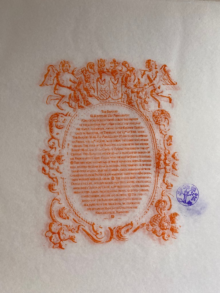 The first menu is composed of white asparagus, beets & smokedeels, stuffed vegetables «à la niçoise», pork terrines, raw vegetables with an aïoli, selected cheeses, cakes ambassadeurs with candied fruits from Provence and marzipan, tarts with «sanddorn», tarts with red berries & cream. The second menu, served as a Dutch still life, includes smoked fish (eels, matjes, sprats, etc.), anchoïade d’Austin de Croze, raw vegetables, olives, breads, fresh butter, cakes, fresh seasonal fruits, selected cheeses, confectionery, biscuits and flowers. The two editions of the Banquets are printed by hand on silk paper with the orange ink, incorporating the epitaph by Hans Jacob Uhle from the Nikolaikapelle, Hannover.