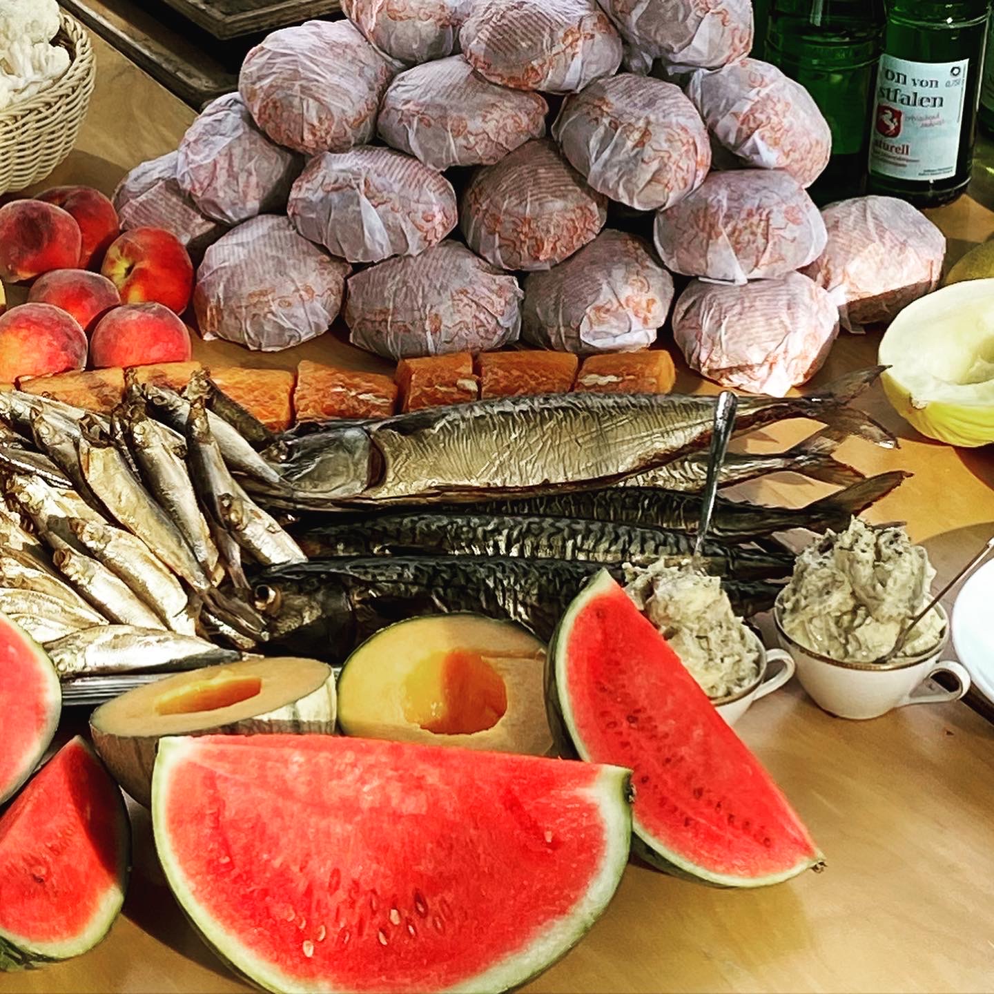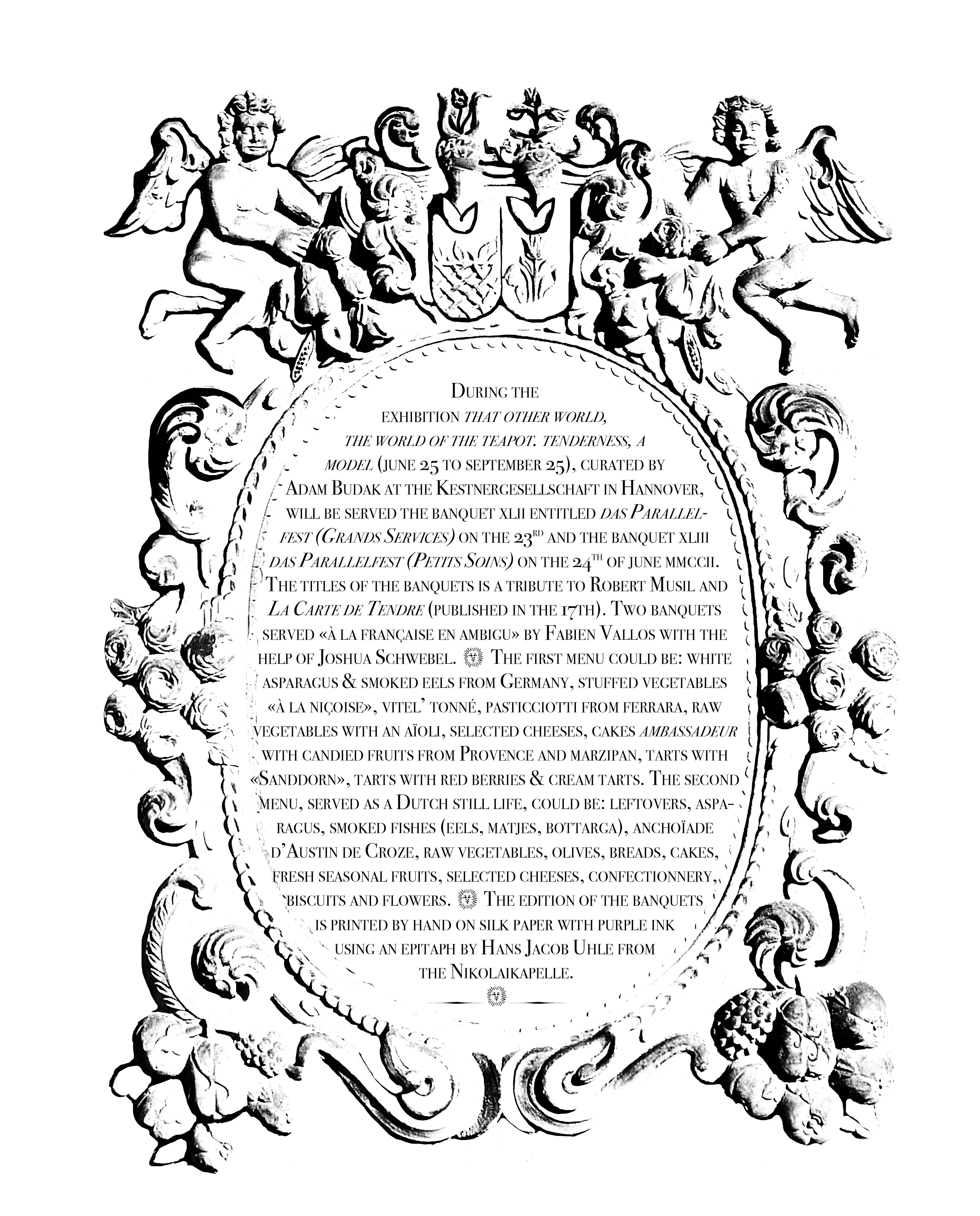 The first menu is composed of white asparagus, beets & smokedeels, stuffed vegetables «à la niçoise», pork terrines, raw vegetables with an aïoli, selected cheeses, cakes ambassadeurs with candied fruits from Provence and marzipan, tarts with «sanddorn», tarts with red berries & cream. The second menu, served as a Dutch still life, includes smoked fish (eels, matjes, sprats, etc.), anchoïade d’Austin de Croze, raw vegetables, olives, breads, fresh butter, cakes, fresh seasonal fruits, selected cheeses, confectionery, biscuits and flowers. The two editions of the Banquets are printed by hand on silk paper with the orange ink, incorporating the epitaph by Hans Jacob Uhle from the Nikolaikapelle, Hannover.
