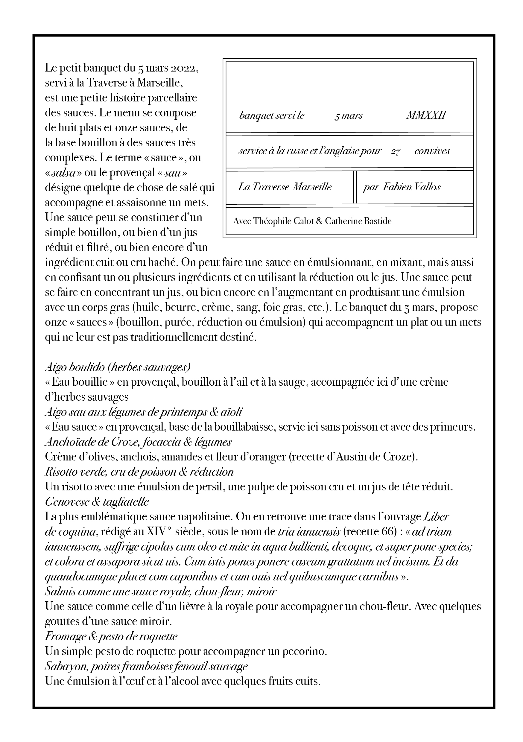 Dans le cadre de l’Inventaire des gastronomies de Méditarranée, l’espace d’art la Traverse à Marseille et Catherine Bastide, nous invitent à faire quelques petits banquets historiques : le 23 octobre 2021, une histoire parcellaire des raviolis en Méditerranée, le 5 mars 2022, une histoire fragmentaire des sauces en Méditerranée, etc. Ils sont réalisés avec Théophile Calot.