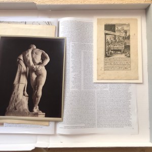 Boîte d’archive A3, journal (éd. à 20 ex. numérotés) et documents d’archives. Il s’agit de l’édition des archives du projet et la présentation d’œuvres anciennes dont une gravure de Jacques-Marie VÉRAN, Anciens monuments d’Arles en Provence, 1804, une gravure au burin de Giacomo CAPUTO, Empedocle filosofo, ca. 1650, une gravure de Benigno BOSSI, Diogène couché, 1784, une gravure de TARDIEU d’après H. Grevelot, Mucius Scaevola, 1798, une gravure anonyme d’Ulysse et les Lotophages, XVIIIe siècle, une gravure «Auribus æque ac lingua detrahitur » in Veridicus Christianus de Jan DAVID, 1597-1601, une photographie de Giacomo BROGI, Ercole Farnese, Napoli, tirage albuminé, ca. 1875, une gravure anonyme de Homère, 1685, une gravure d’Empedocles philosophus, de Pieter VAN DER AA in Jakob Gronovius, Thesaurus græcarum, 1698, etc.