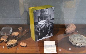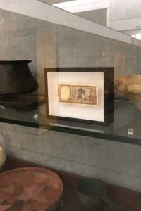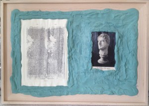 30 x 45 cm, cadre en bois, plâtre teinté dans la masse et documents (extrait du Pap. Vat. gr. 11 – col. XVII/XVIII ; carte postale – tête d’Hadrien, éd. Musée Lapidaire, Arles).