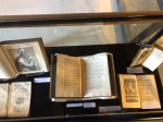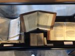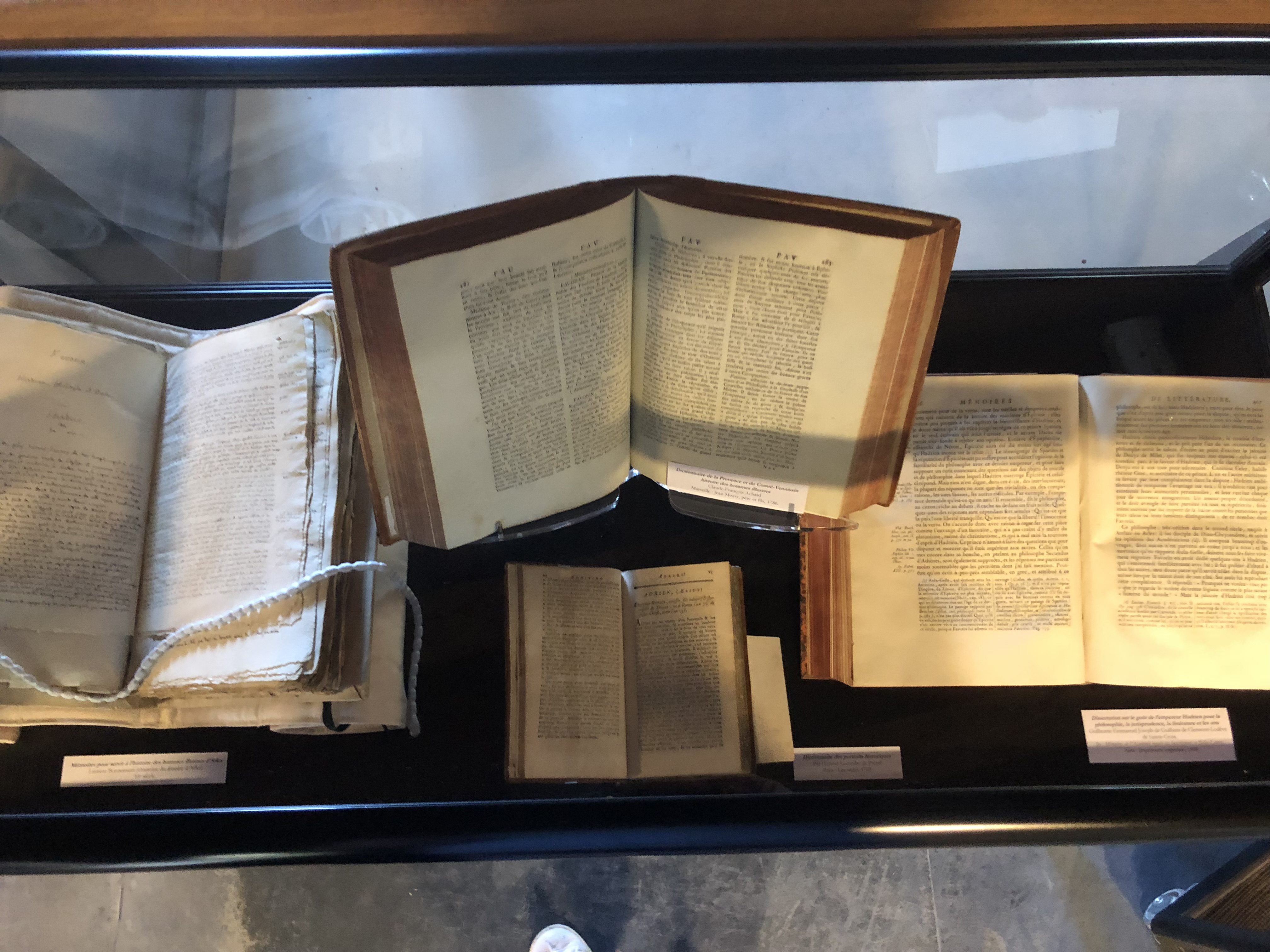40 x 60 x 8,5 cm, cadre en bois, verre, tissu, cire bleue, livre (Un Philosophe provençal au temps des Antonins ; Favorin d’Arles. Sa vie, ses œuvres, ses contemporains, Ludovic Legré, ed. Aubertin & Rolle, 1900) et stylet romain en argent, ca. IIe s. ec.