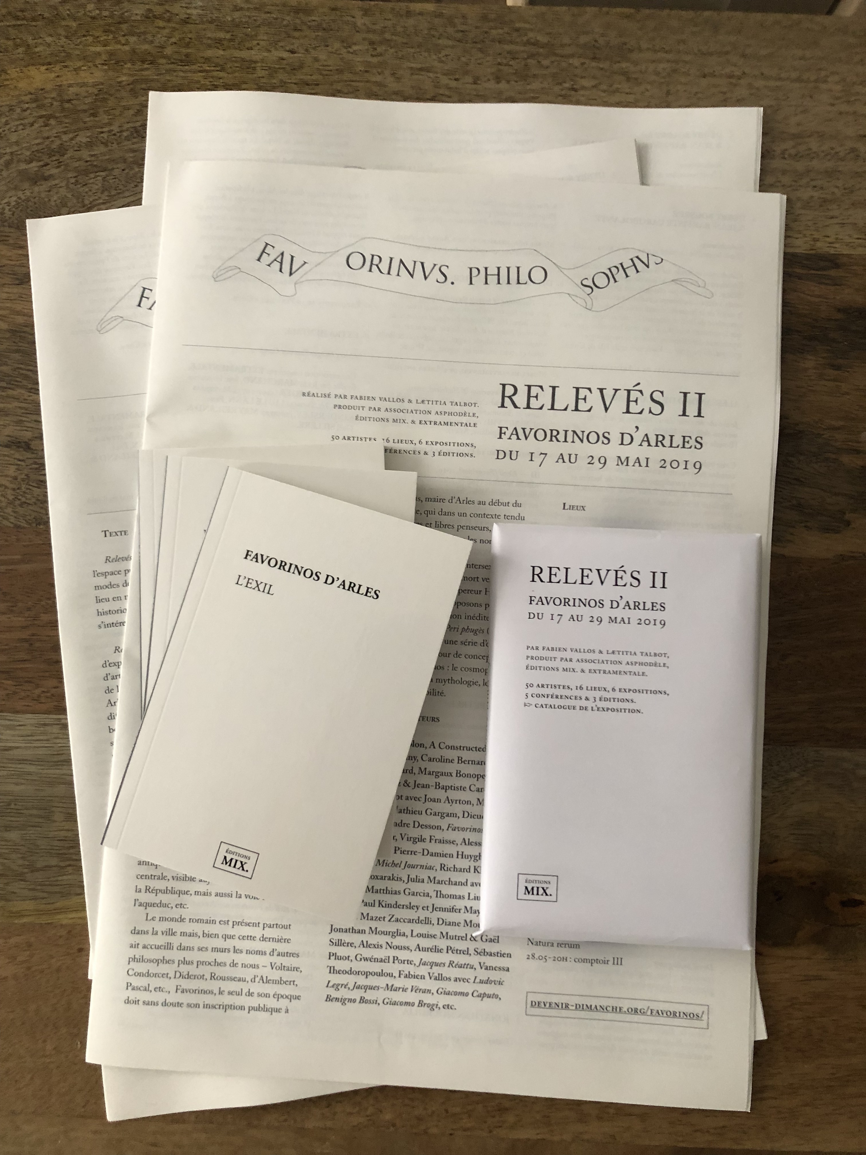 • un ouvrage, FAVORINOS d’ARLES, L’Exil, traduit du grec et commenté par Fabien VALLOS, 96 pages, éditions Mix., 2019, 7 euros. En vente dans tous les lieux d’exposition et les librairies de la ville. Diffusion Les Presses du réel.