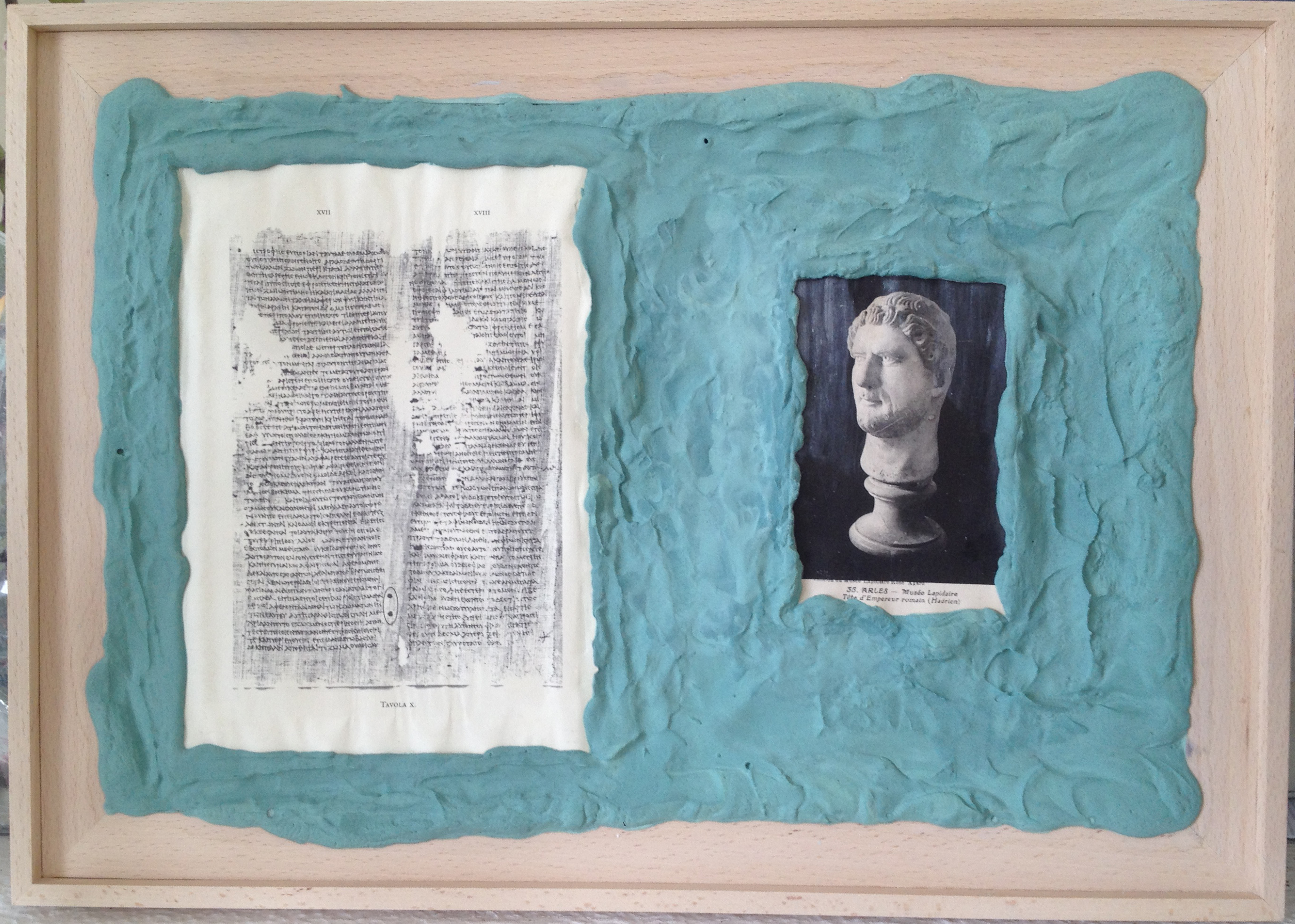 30 x 45 cm, cadre en bois, plâtre teinté dans la masse et documents (extrait du Pap. Vat. gr. 11 – col. XVII/XVIII ; carte postale – tête d’Hadrien, éd. Musée Lapidaire, Arles).