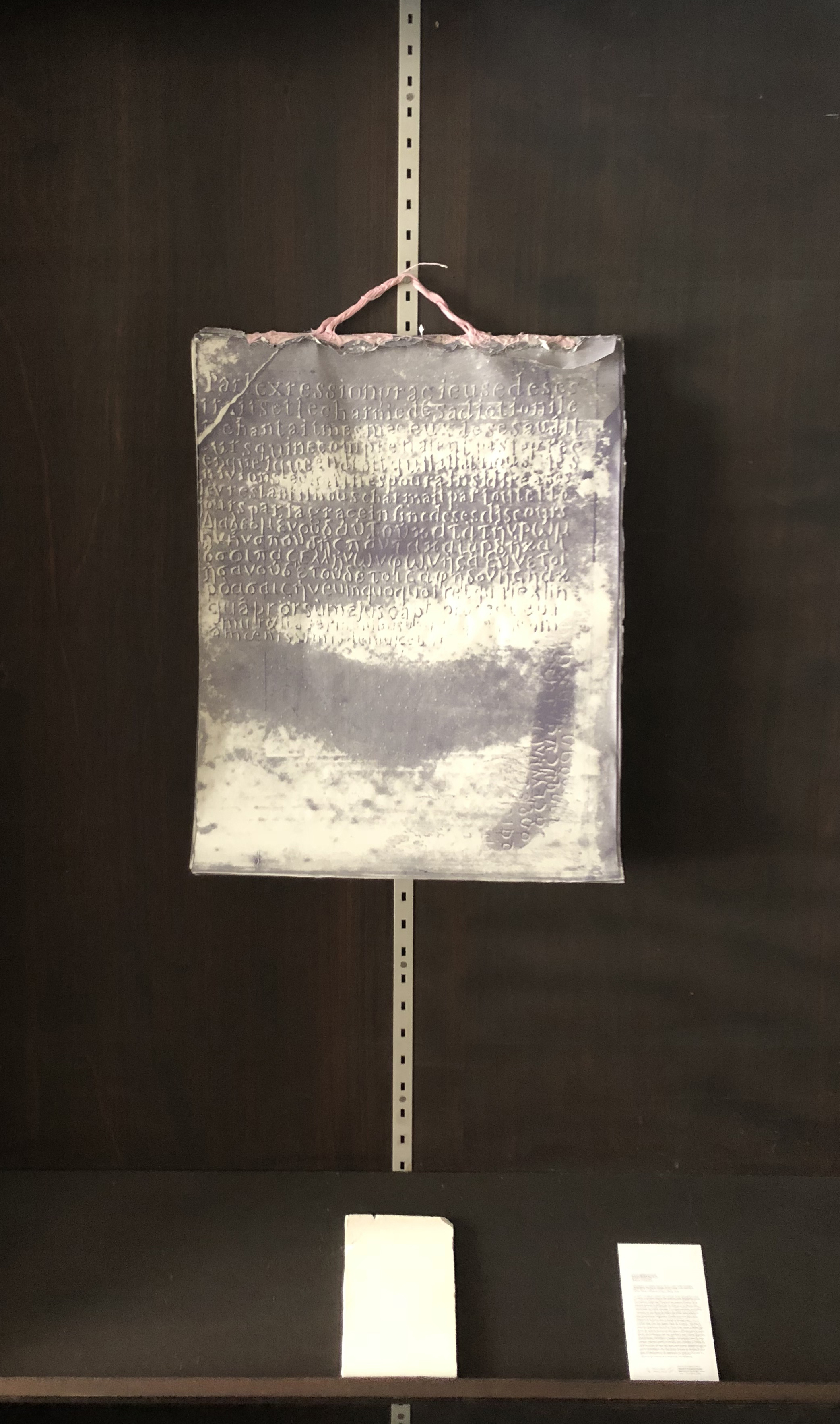 Le texte associe des extraits du livre de Ludovic Legré sur Favorinos. Il traite de l’écriture en scriptio continua ou écriture continue, qui est une façon de rédiger sans espace ni ponctuation. Guglielmo Cavallo écrit in l’Histoire de la lecture dans le monde occidental, 1997 : « […] il fallait donc plus que jamais l’aide de la parole : une fois la structure graphique déchiffrée, l’ouïe était mieux à même que la vue de saisir la succession des mots ». La multiplicité des techniques (gravure, photographie, traitement d’images, sérigraphie) rend le texte partiel et brouille son contenu à l’instar de certains textes anciens qui nous parviennent abîmés et que les outils des chercheurs tentent de révéler.
