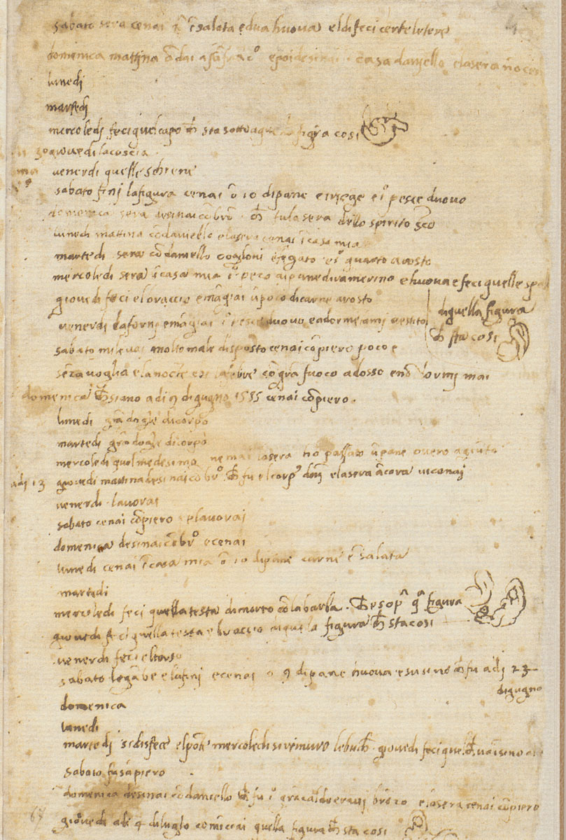 Adì 11 di marzo 1554 in domenica mattina desinai con Bronzino pollo e vitella e senti’mi bene (vero è che venendo per me a casa io ero ne’ letto, era asai ben tardi e levandomi mi sentivo gonfiato e pieno, era asai bel dì); la sera cenai un poco di carne secha arostoche havevo sete e lunedì sera cenai uno cavolo e uno pesce d’uovo.