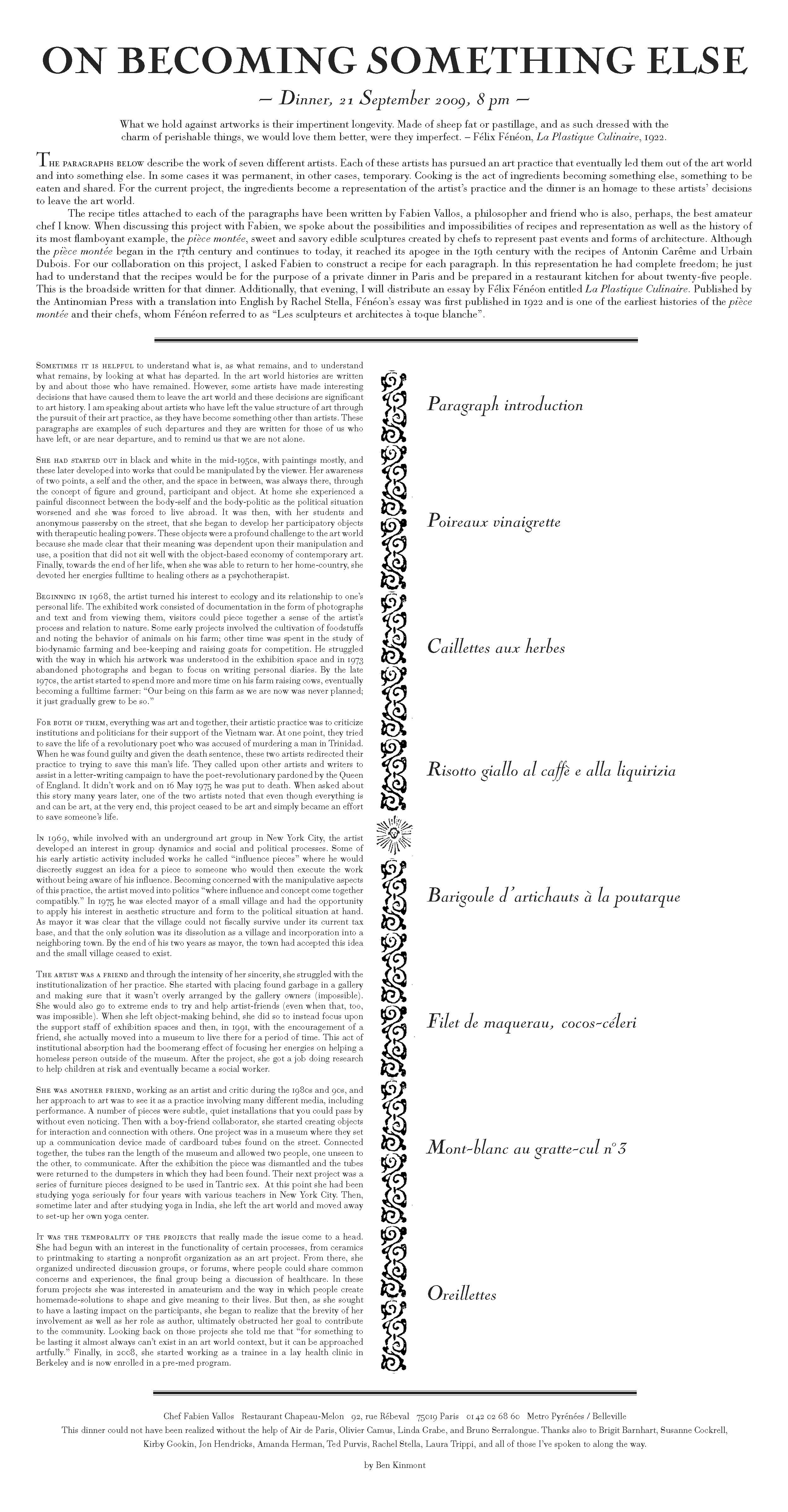 Sur l’invitation de Ben Kinmont, j’ai participé à ce projet comme théoricien et comme cuisinier amateur. Le projet a alors consisté à proposer sept plats qui correspondaient chacun à un des sept statements et qui pouvaient dès lors être proposé à un dîner. Ce dîner fut servi le 21 septembre 2009, à Paris, pour trente cinq personnes. Les sept statements ont été, ensuite, proposé à sept chefs parisiens qui ont conçu un plat qui a été servi à leur carte durant les deux mois de l’exposition au Centre Georges Pompidou.