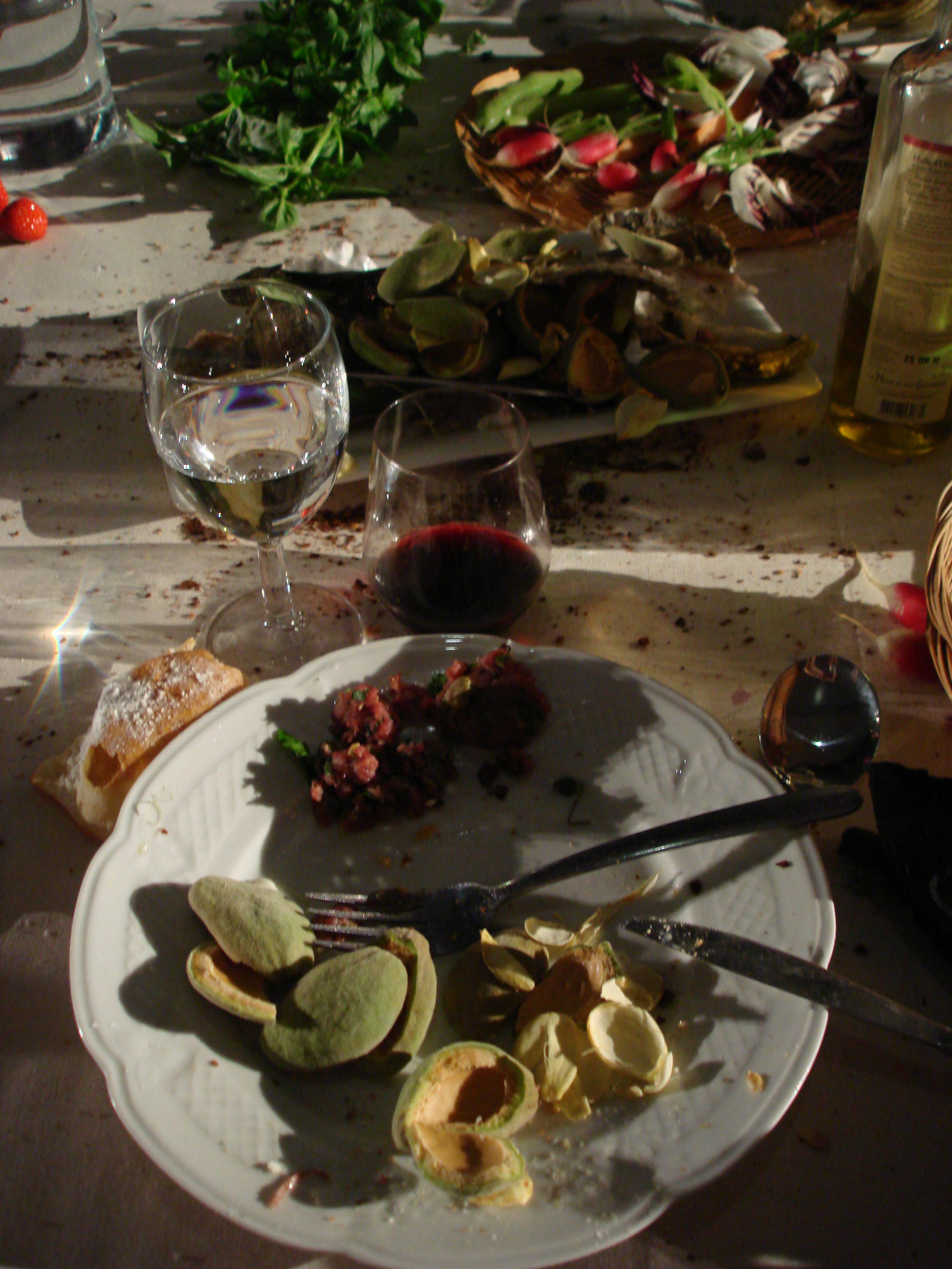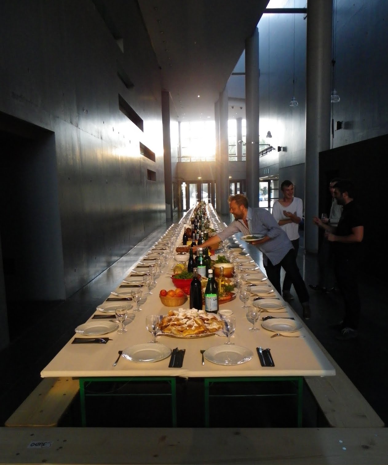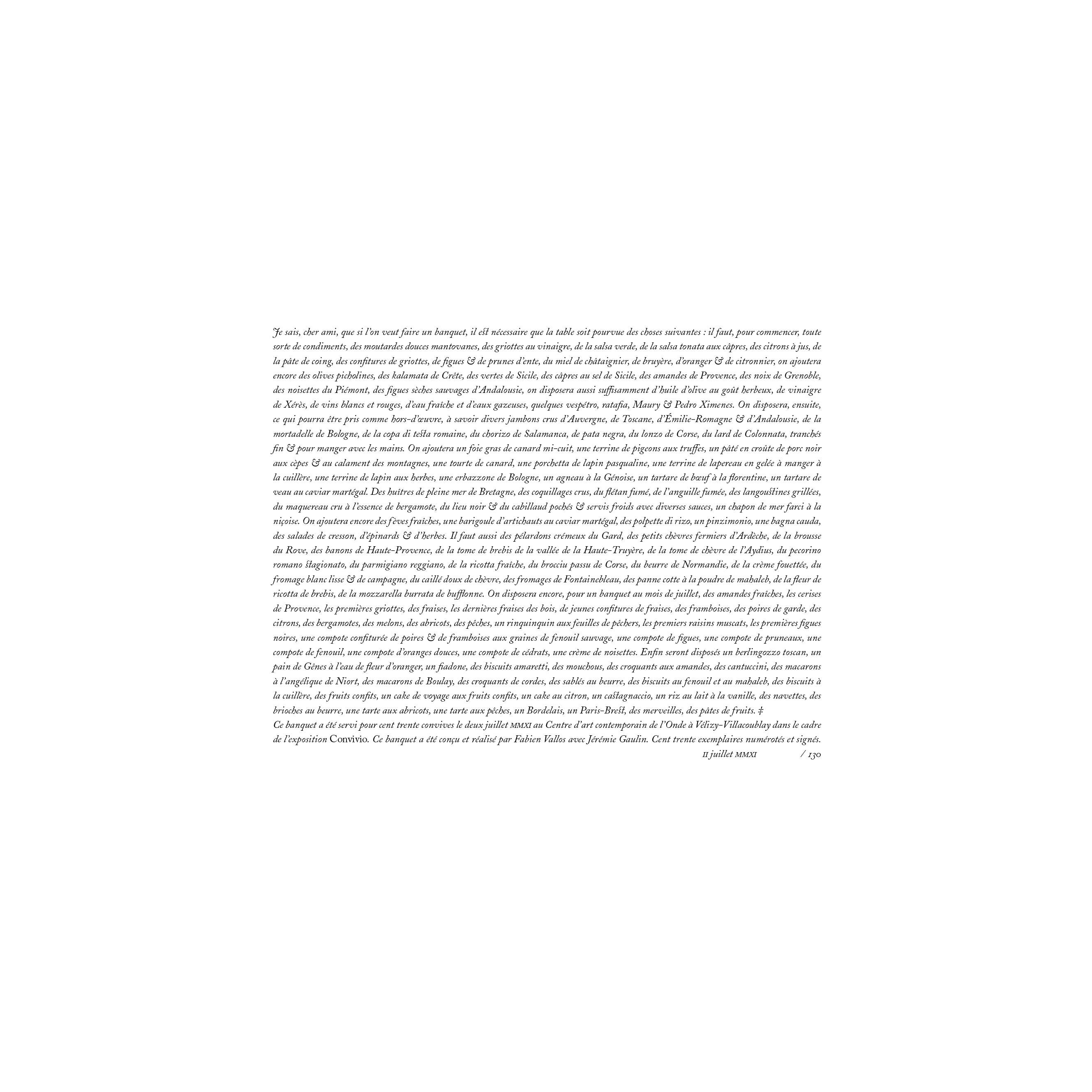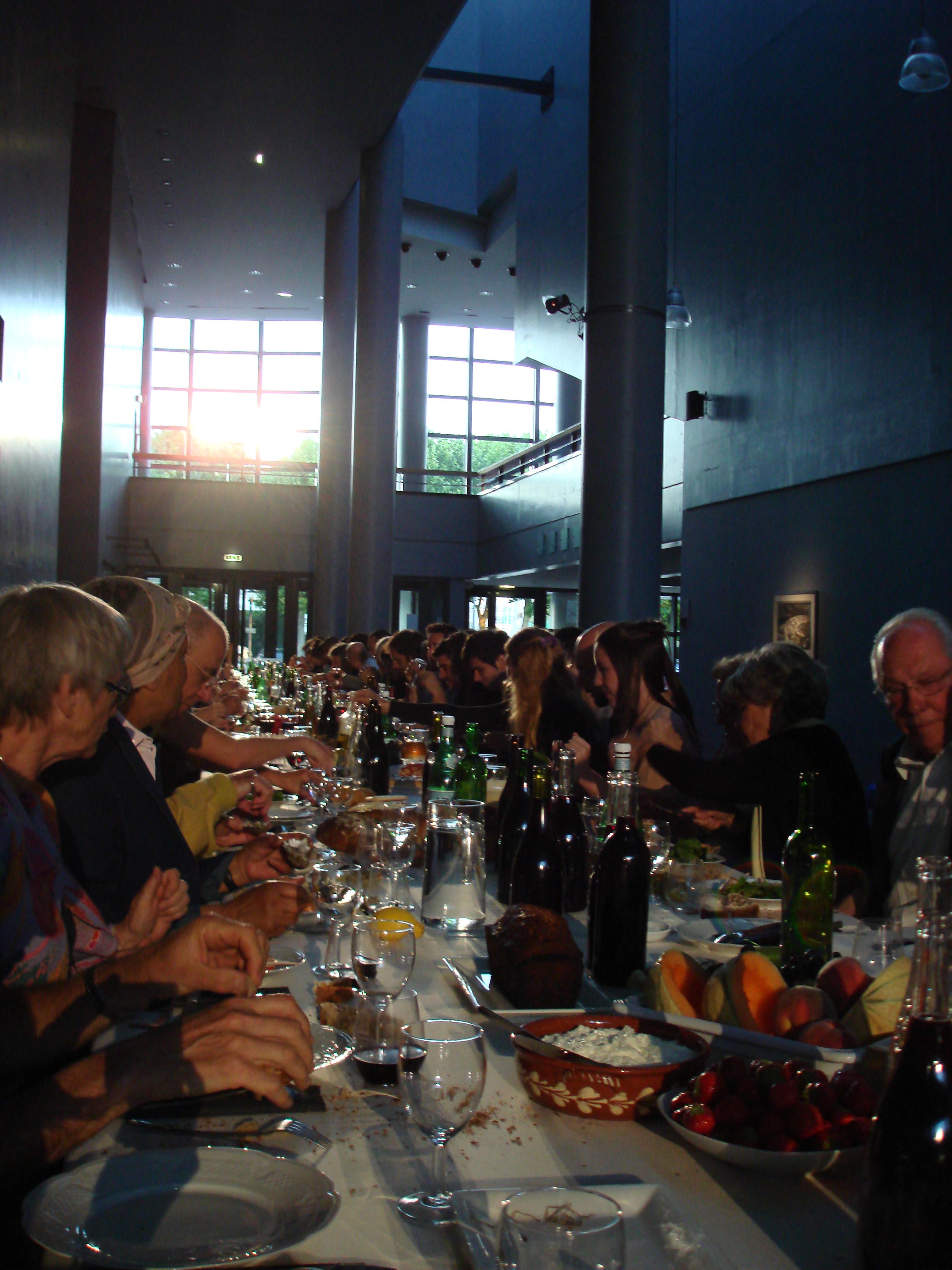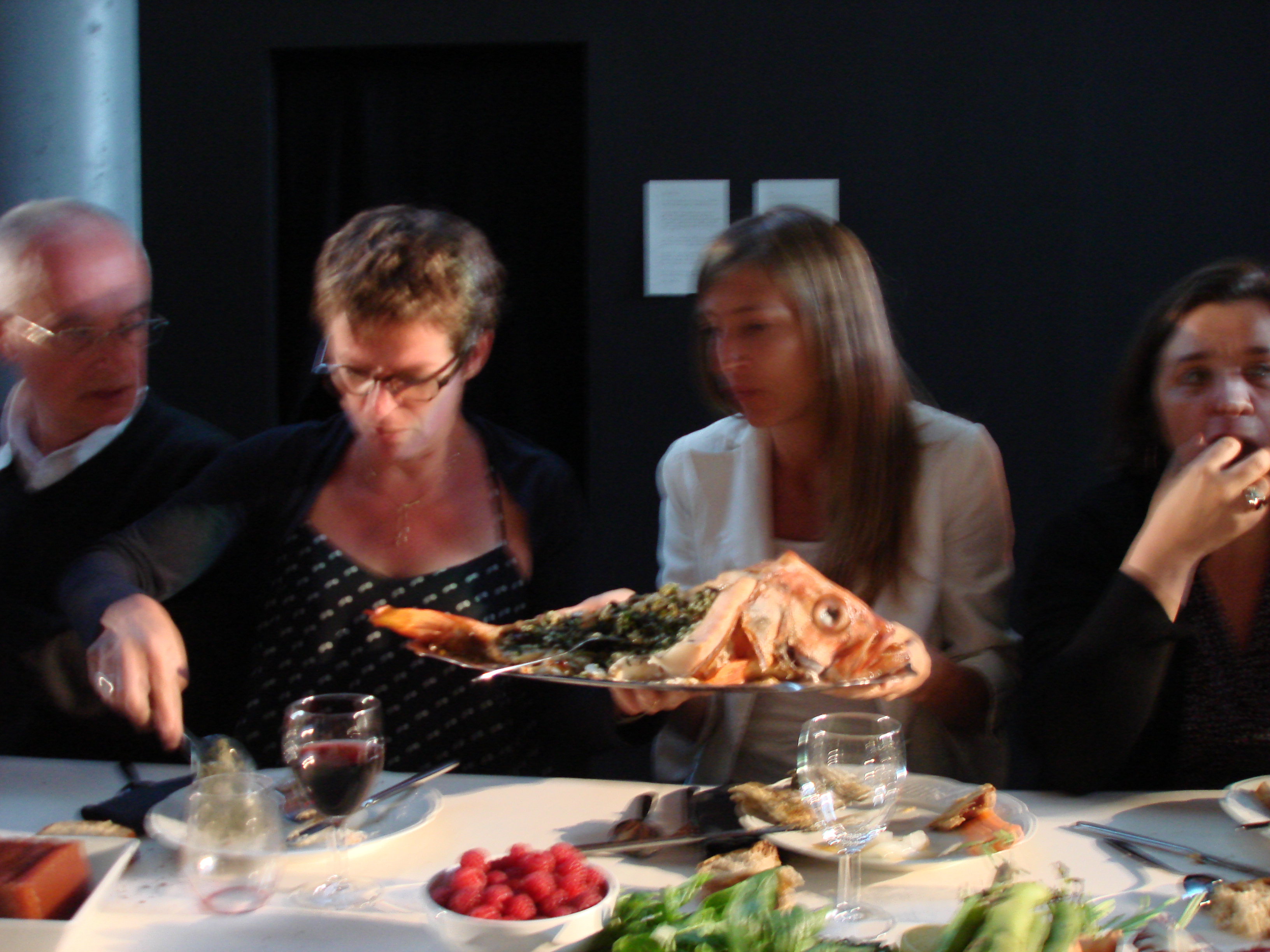 Ce banquet a été servi pour cent trente convives le deux juillet 2011 au Centre d’art contemporain de l’Onde à Vélizy-Villacoublay dans le cadre de l’exposition Convivio.